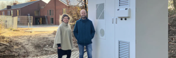 Bestuurder Bertine van Winkel en nieuwbouw-projectleider Robin Brokmann bij de nieuwe batterij. Op de achtergrond de nieuwe woningen.(Foto ED)