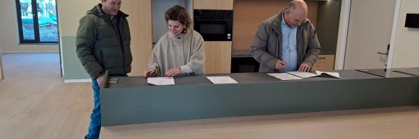 Het officiële moment werd bekrachtigd met de ondertekening van het opleverdocument door onze bouwpartners Alexander Schoonenberg van Bouwbedrijf Peter Peters en Peter de Wit van Van Delft Groep en door onze bestuurder Bertine van Winkel. Trots op deze stap richting een warme en fijne woonplek voor onze bewoners!