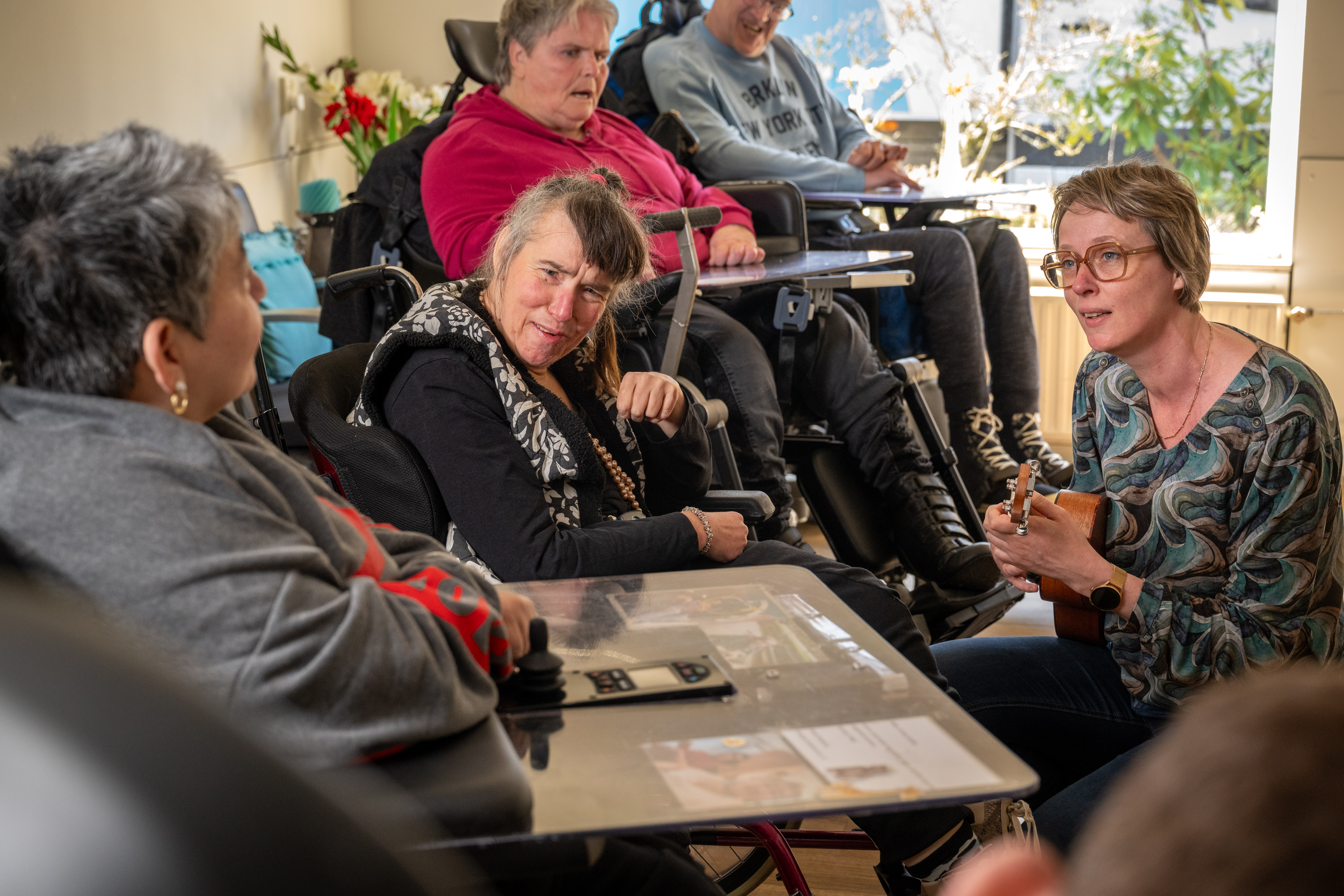 “In mijn contact met cliënten gaat het over ‘vragen achter de vragen'. Wie ben ik, waar hoor ik bij? Vaak gaat het over verlies en rouw. Cliënten maken van alles mee en moeten daar, net als ieder ander, hun weg in vinden. Denk aan het overlijden van iemand die dierbaar is, of ouders die ziek worden. Of simpelweg het samenwonen met een aantal anderen in één huis. Maar ook vragen als: waarom ben ik anders dan anderen? Wat helpt me om mijn stem te laten horen, ook als ik niet kan praten? Ik ondersteun door ruimte en aandacht te bieden en samen met hen te zoeken naar wat het soms zo moeilijk maakt.”